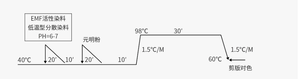 EMF系列活性染料是染料發展中的重大研發成果,實現了活性染料無堿染色的誕生。在中性染色條件下有較高的上染率表現,降低了染料的水解速率,該系列染料染色同步性和配伍性好,在染色和加色中操作方便快捷,勻染性好不易產生色花,縮短了染色工藝時間,提高生產效率同時降低了染色綜合成本。適用于棉、麻等纖維素纖維等淺中色系列的染色,同時適用于分散/活性一浴法等混紡織物淺色系列的染色。